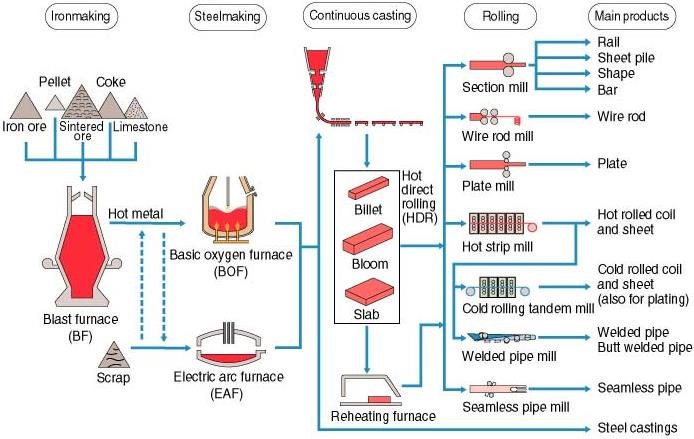 Steelmaking is the process of producing steel from iron ore and/or scrap. In steelmaking, impurities such as silicon, phosphorus, sulphur, and excess carbon (the most important impurity) are removed from the sourced iron, and alloying elements such as manganese, nickel, chromium and vanadium are added to produce different grades of steel.